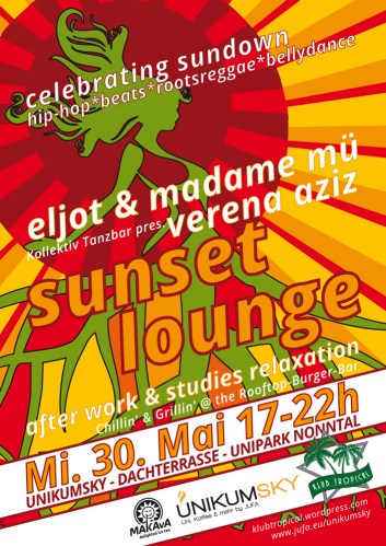UnikumSky, Kollektiv Tanzbar und Klub Tropical freuen sich schon auf zahlreiche Chillout-Gäste, die diesen Rooftop Sunset gemeinsam zum Erlebnis machen. Wo? Auf der Dachterrasse des Unipark Nonntal (4. Stock) im Café UnikumSky, am Mittwoch 30. Mai von 17:00 – 19:00 h.
