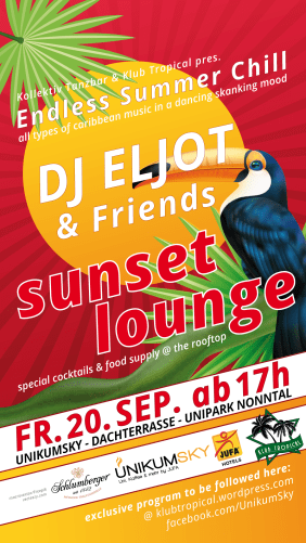 UnikumSky, Kollektiv Tanzbar und Klub Tropical freuen sich schon auf zahlreiche Chillout-Gäste, die diesen Rooftop Sunset gemeinsam zum Erlebnis machen. Wo? Auf der Dachterrasse des Unipark Nonntal (4. Stock) im Café UnikumSky, am Freitag den 20. September ab 17:00 h.