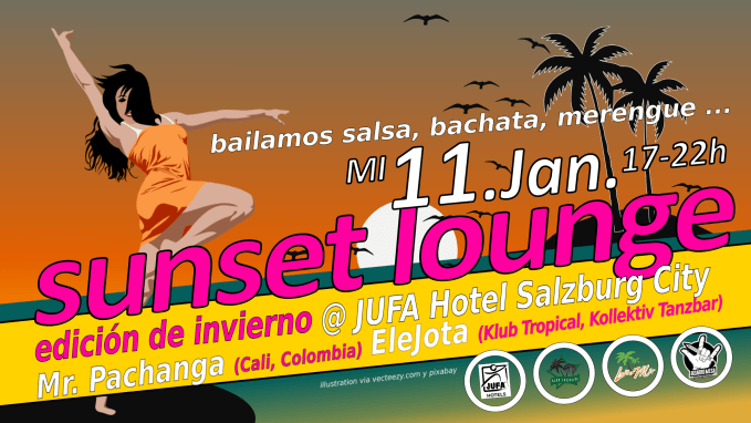 El año nuevo empieza con fiestas – con Música Latina buena en un ambiente especial. Nos encontramonos en el JUFA Hotel Salzburg City y ahí en el Salon „Wolferl“. Un lugar especial como un hogar de nosotros. Tenemos una Pista, Luces y DJ’s que saben cual canciones estan llamando para bailar en parejas.