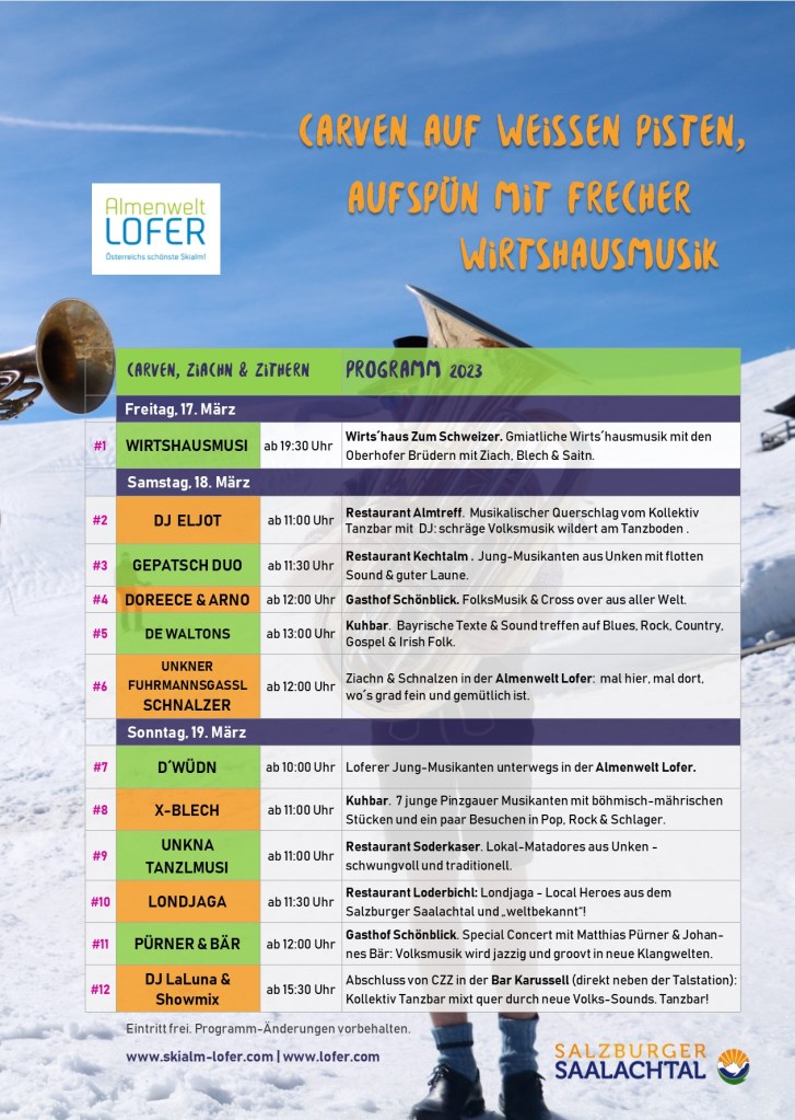 Skifahren auf den sonnigen Pisten der Almen von Lofer und bei Konzerten an Hütten & Bühnen mittanzen: Das Musikfestival „Carven, Ziachn & Zithern“ geht heuer vom 17. bis 19. März in die nächste Runde – mit schräger Volksmusik, frecher Wirtshausmusik, buntem Cross-over und spontanen Begegnungen unterschiedlicher Musiker und Stilrichtungen.