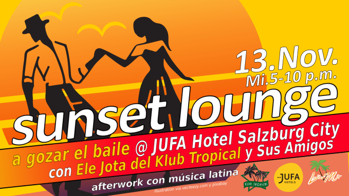 Get ready for another captivating evening at the JUFA Hotel Salzburg City, as the Sunset Lounge series returns on Wednesday, November 13th. This time, we bring you „Guacancó y Bachata“, a night dedicated to the energetic rhythms of Guacancó and the romantic beats of Bachata. From 5 PM to 10 PM, come and enjoy an evening filled with Latin music and vibrant energy.